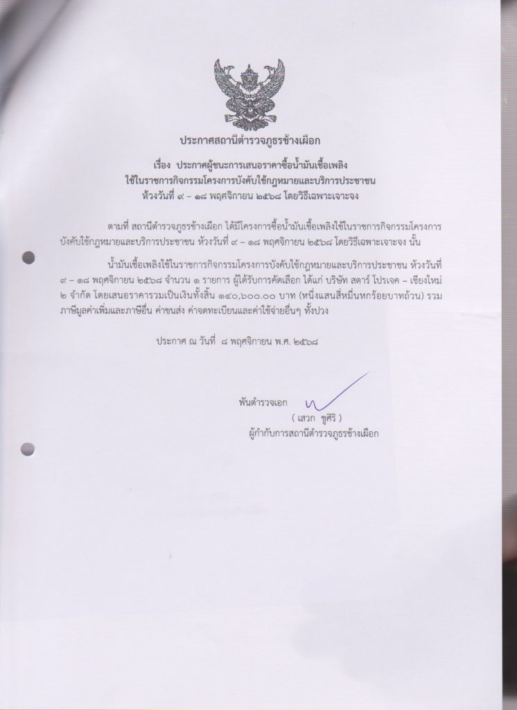 ประกาศผู้ชนะการเสนอราคาการจัดซื้อน้ำมันเชื้อเพลิง พฤศจิกายน 2568