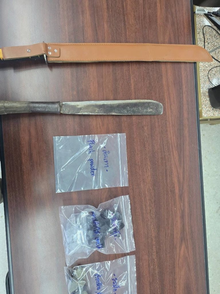 • อาวุธมีดยาวรวม 70 เซนติเมตร ใบมีดยาว 50 เซนติเมตร จำนวน 1 เล่ม
