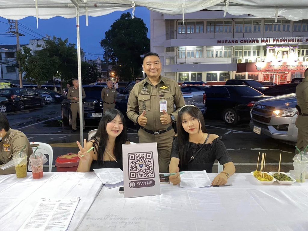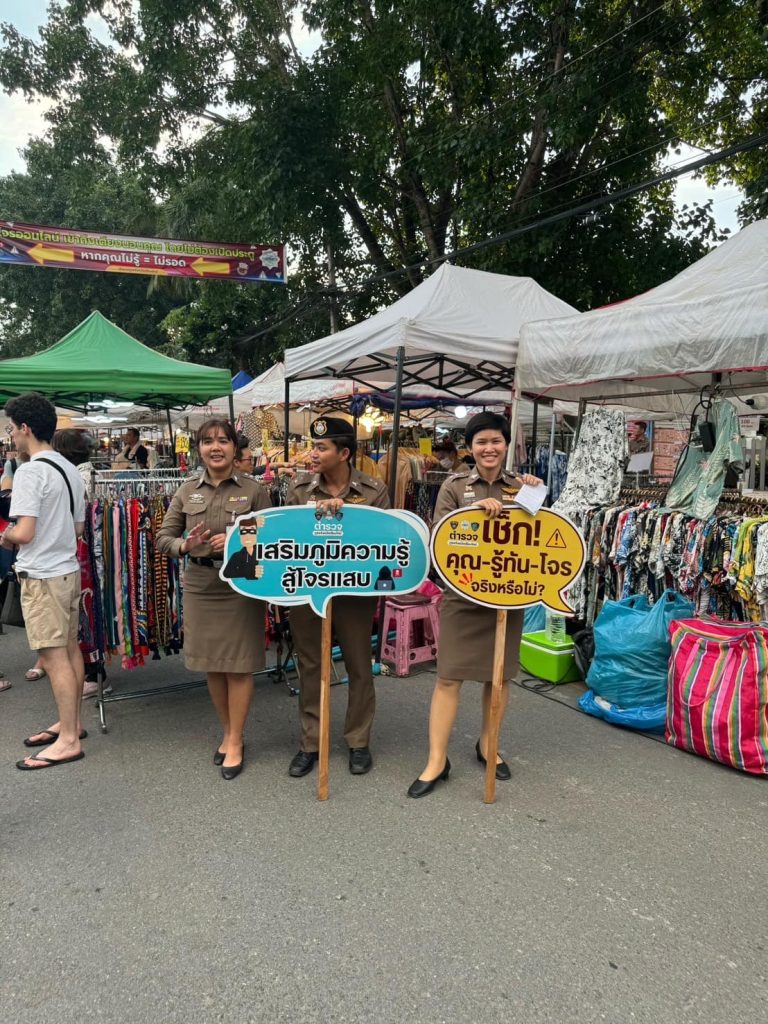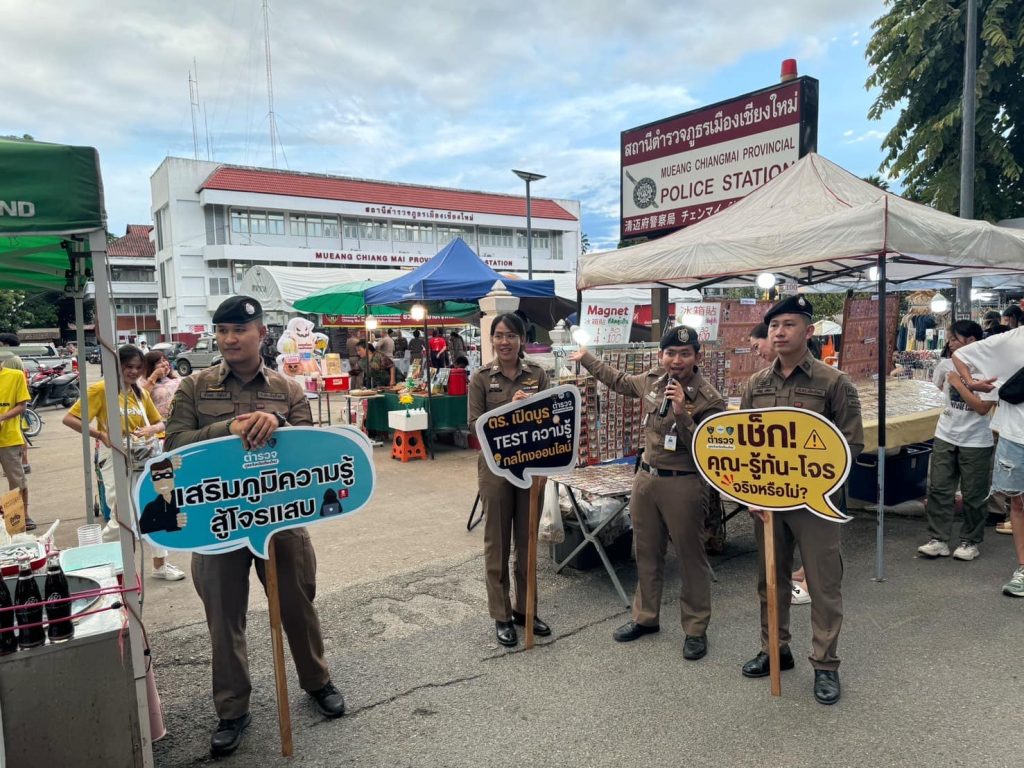 สภ.ช้างเผือก ขนทัพตำรวจในสังกัด จัดบูธนิทรรศการ ให้ความรู้เกี่ยวกับการป้องกันภัยออนไลน์ ถนนคนเดินวันอาทิตย์