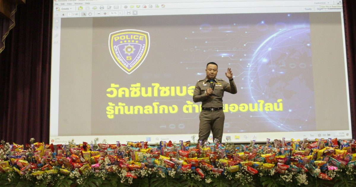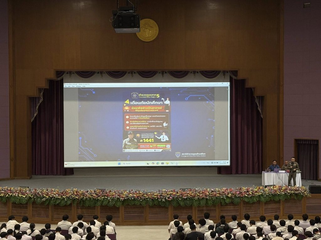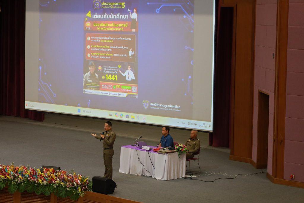 วันที่ 25 มิ.ย. 68 เวลา 10.00 น. โดยการอำนวยการของ พ.ต.อ.เสวก ชูศิริ ผกก.สภ.ช้างเผือก มอบหมายให้ พ.ต.ท.ปิยะพงษ์ ชัยนำ สว.อก.ฯ และ ร.ต.ท.บุญเลิศ พูลผล รอง สว.(ป.)ฯ ร่วมเป็นวิทยากรบรรยายให้ความรู้ในหัวข้อการใช้ชีวิตโลกดิจิทัลอย่างฉลาดและปลอดภัย แก่นักศึกษาคณะวิศวกรรมศาสตร์ มหาวิทยาลัยเทคโนโลยีราชมงคลล้านนาฯ ระดับปวส. และระดับปริญญาตรี ประจำปีการศึกษา 2568 ณ หอประชุมมหาวิทยาลัยเชียงใหม่