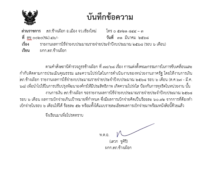 รายงานการใช้จ่ายงบประมาณประจำปี 2568 สภ.ช้างเผือก ต่อหัวหน้าสถานี